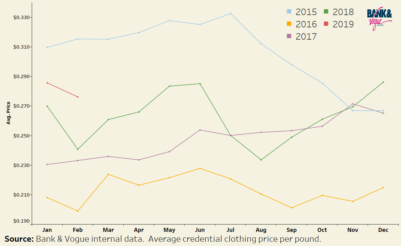 The price of credential clothing is always a good indicator of how donations are flowing, as price is directly related to the offer of product in the market. The main factor impacting the availability of credential clothing in early Spring is weather. Long Winters delay the donation ramp up and also make logistics complicated.
